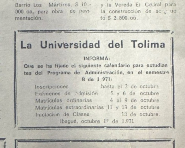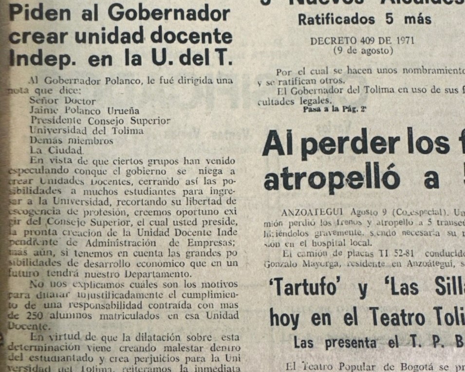 A lo largo de los años, la Universidad del Tolima ha sido protagonista de múltiples noticias que reflejan su crecimiento, sus logros y su aporte al desarrollo regional y nacional. En esta sección presentamos una recopilación del periódico El Cronista, de finales de los años sesenta y comienzos de los setenta, donde la UT quedó registrada como símbolo de transformación educativa y social. Estos archivos son testimonio vivo del papel que la Universidad ha desempeñado en la historia del Tolima y del país.